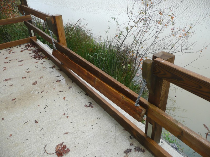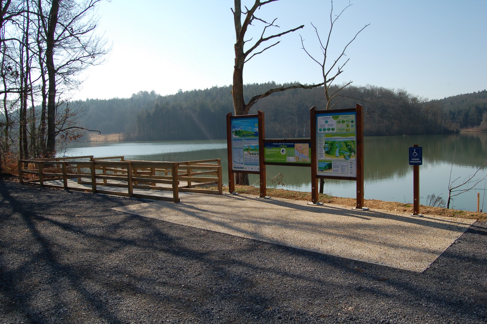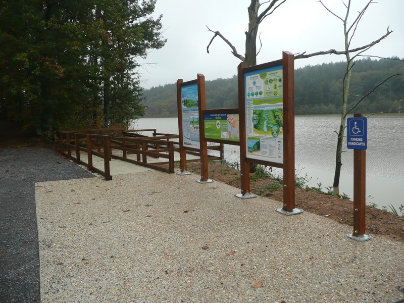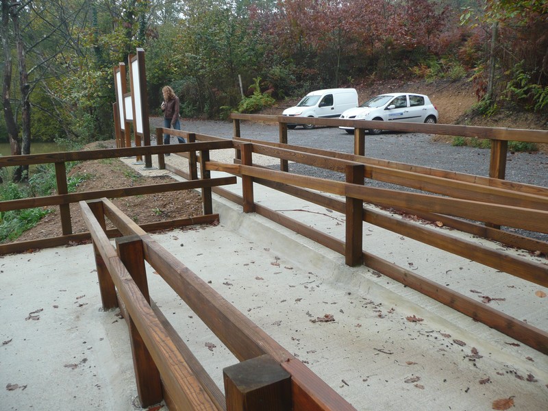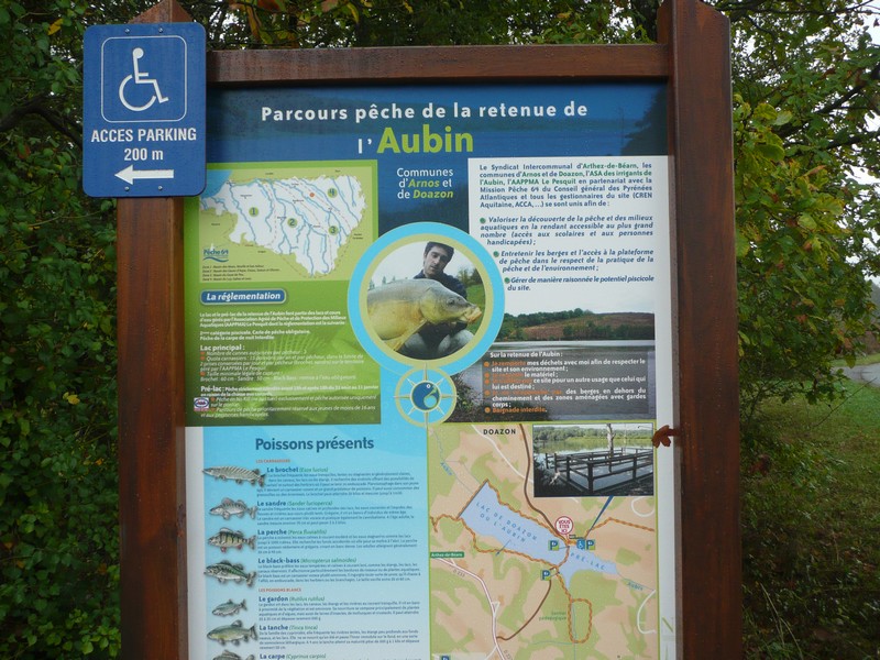Il s’agit d’un ponton de pêche installé au bord d’un lac géré par la communauté de commune d’Arthez de béarn. Le poisson peut être pêché, mais il doit être remis à l’eau. Une pré-signalisation indique l’emplacement du parking adapté et exclusivement réservé pour les clients en situation de handicap (tous handicaps), un emplacement de 3,5O m de large donne directement accès au front de pêche du ponton. Un panneau adapté inférieur à 1,30m donne les informations générales ainsi que les numéros d’urgence. Une pente douce inférieure à 3% avec paliers de repos et avec main courante à 80cm de hauteur conduit sur l’espace de pêche pour deux personnes avec un garde corps à 40 cm de hauteur afin de pêcher dans de bonnes conditions. Aire de rotation possible sur le ponton. Aucune dangerosité à hauteur de visage sur la chaîne de déplacement, un panneau d’information est contrasté en couleur et est rédigé en caractères agrandis. Le ponton est protégé par un garde corps à 80 cm de hauteur. Les panneaux d’informations diversifiées renseignent sur la faune piscicole, sur la localisation du site de pêche avec un plan d’ensemble, les numéros d’urgence sont enrichis du nouveau numéro S.M.S qui est le 114. Ce site de pêche protégé par des garde-corps est installé dans un cadre environnemental de qualité et tous les numéros d’urgence sont bien visibles à proximité d’un lac où la baignade est interdite. Un panneau d’informations simplifiées présente le lieu de pêche.
