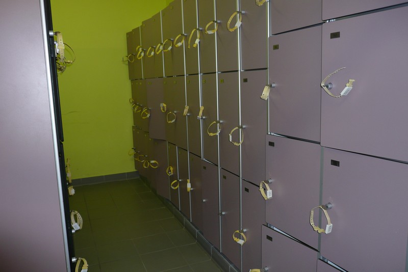 Des casiers à différentes hauteurs sont situés en sortie de cabines.