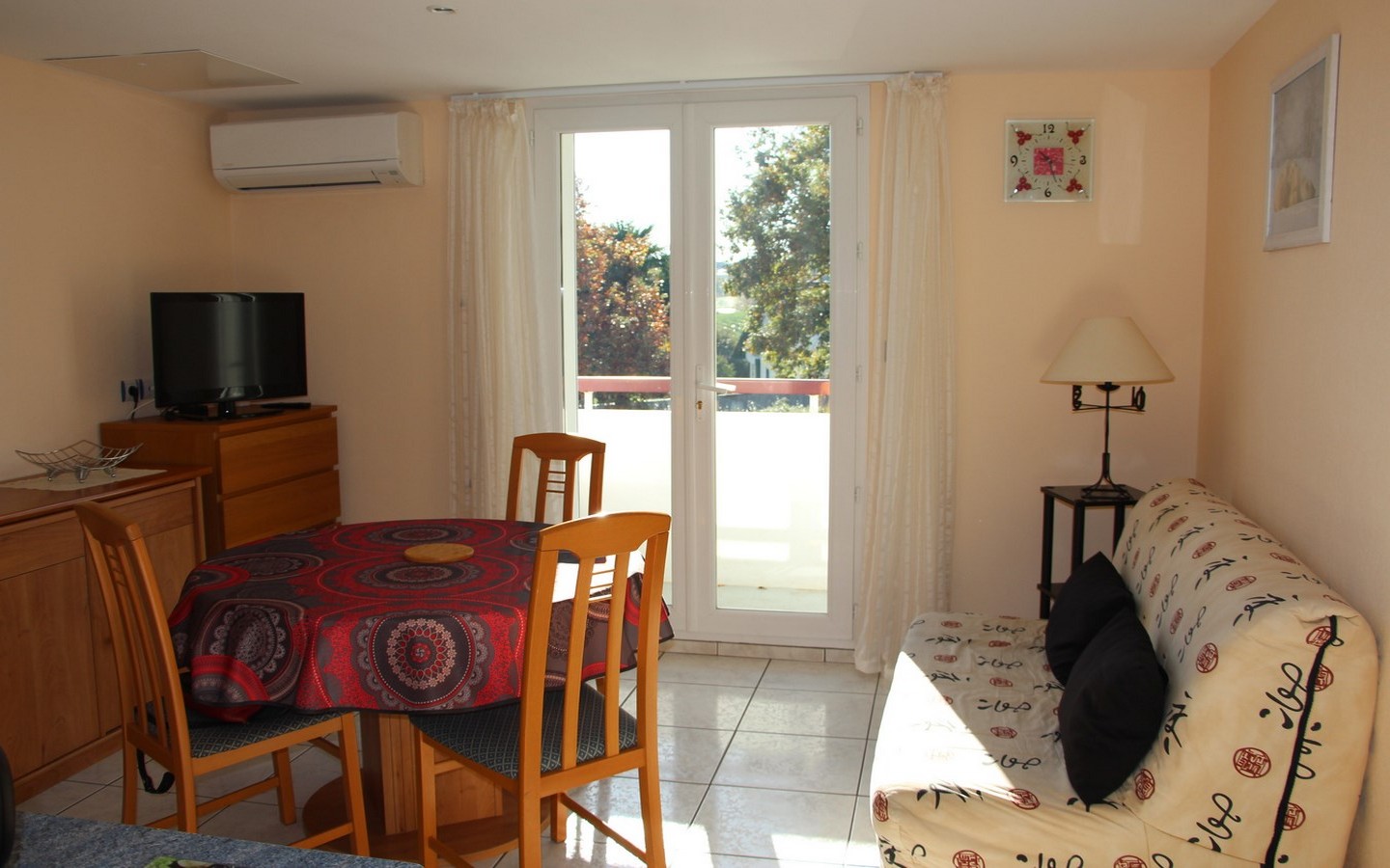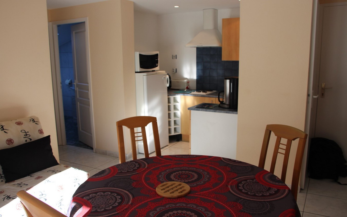 Le coin cuisine composé de 2 plaques de cuisson électriques, d'un réfrigérateur avec compartiment conservateur, d'un mini-four et d'un micro-ondes, est ouvert sur le salon / séjour. Celui-ci dispose d'un canapé, d'un téléviseur écran plat, d'une table ronde et des chaises. 1 chambre avec 1 lit en 140 et placards de rangement. La salle d’eau possède une douche, lavabo, wc et lave-linge. Les animaux sont admis dans la location. En extérieur: parking, balcon. Station thermale réputée, CAMBO LES BAINS a une situation privilégiée : à 25 km à peine des vagues de l’Atlantique et ses stations balnéaires : Anglet, Biarritz, et St Jean de Luz, mais aussi tout prés de Saint Jean Pied de Port et à 5 km d’Espelette.