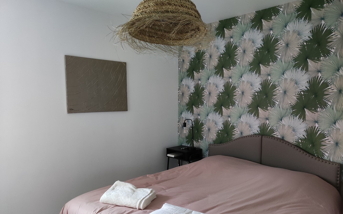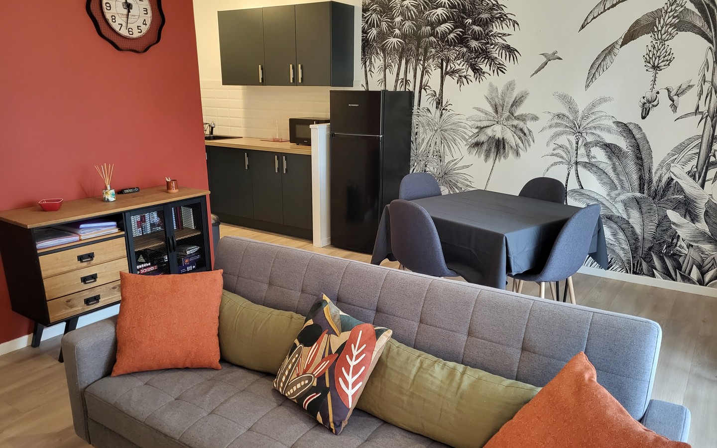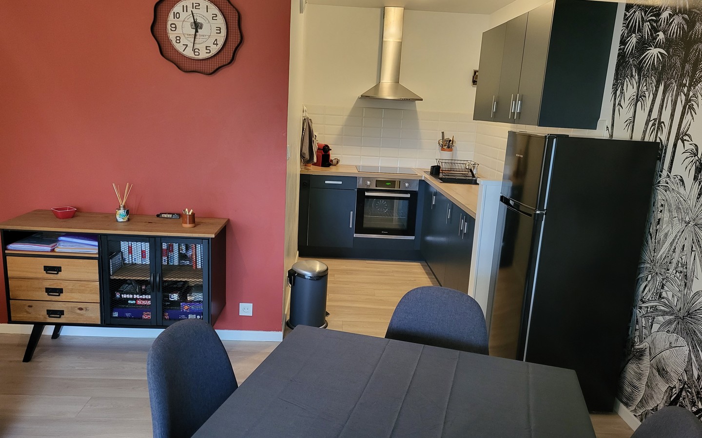 Appartement moderne situé au 1er et dernier étage d'une résidence, dans un quartier résidentiel au calme et à proximité des commerces. La pièce de vie se compose d'une cuisine ouverte entièrement équipée, d'un coin séjour avec une table et 4 chaises, et d'un coin salon avec canapé convertible, table basse et télévision écran plat.
