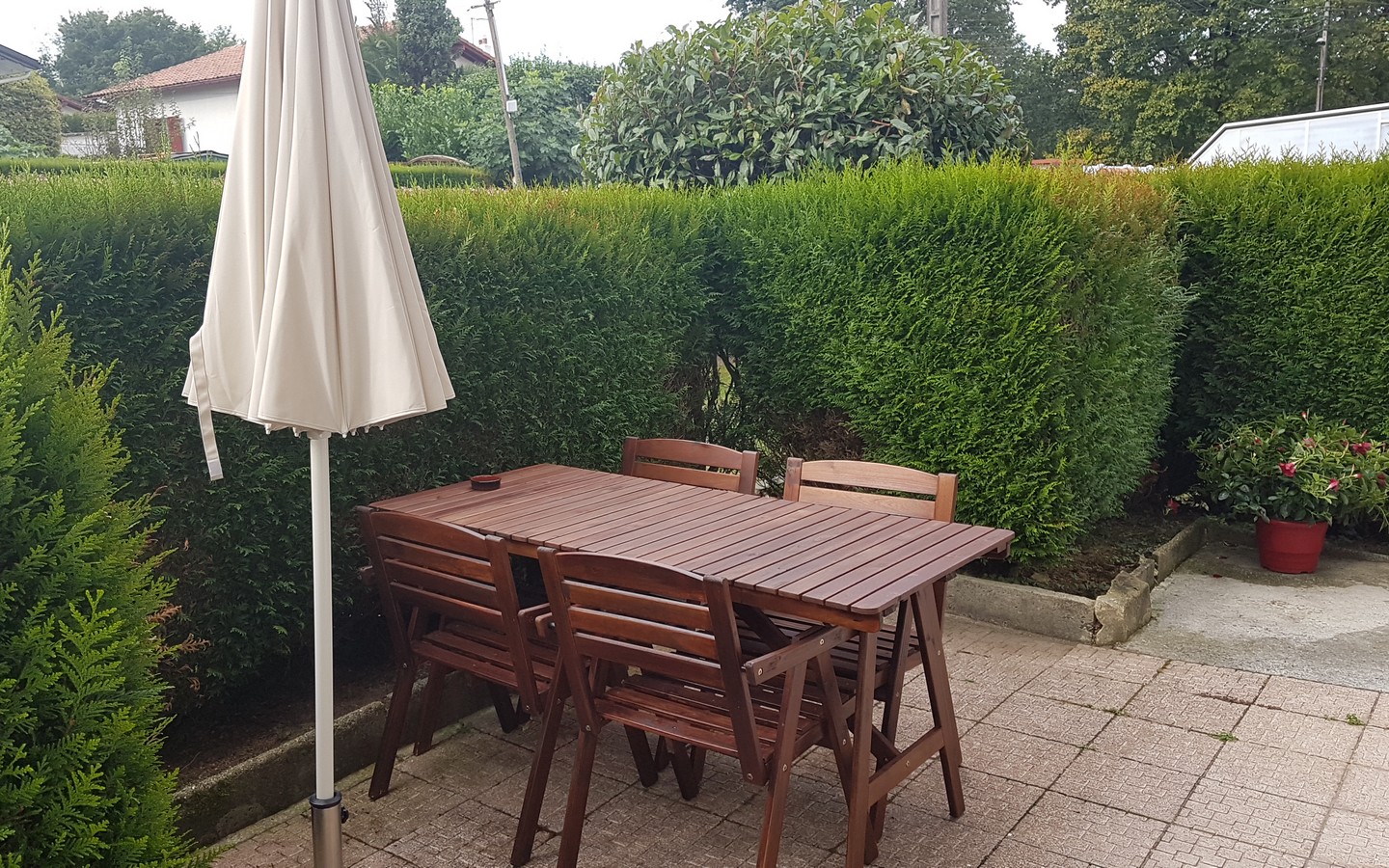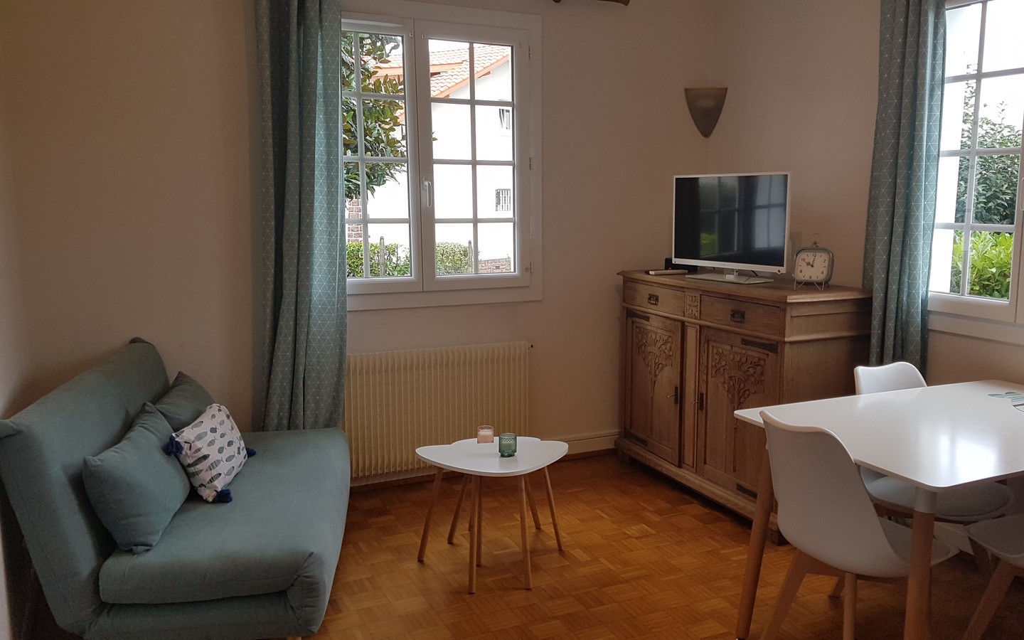 Appartement de 35 m2 situé au rez-de-chaussée de la maison des propriétaires dans un quartier résidentiel de Cambo-les-Bains. Il se compose de 2 pièces : une chambre avec 1 lit en 160, grands placards et coin bureau ; la pièce de vie avec cuisine américaine entièrement équipée ouverte sur le coin séjour salon avec table et 4 chaises, canapé , table basse et télévision écran plat. La salle d'eau dispose d'une cabine de douche et d'un meuble vasque. Les wc sont indépendants. Station thermale réputée, CAMBO LES BAINS a une situation privilégiée : à 25 km à peine des vagues de l’Atlantique et ses stations balnéaires : Anglet, Biarritz, et St Jean de Luz, mais aussi tout prés de Saint Jean Pied de Port et à 5 km d’Espelette.