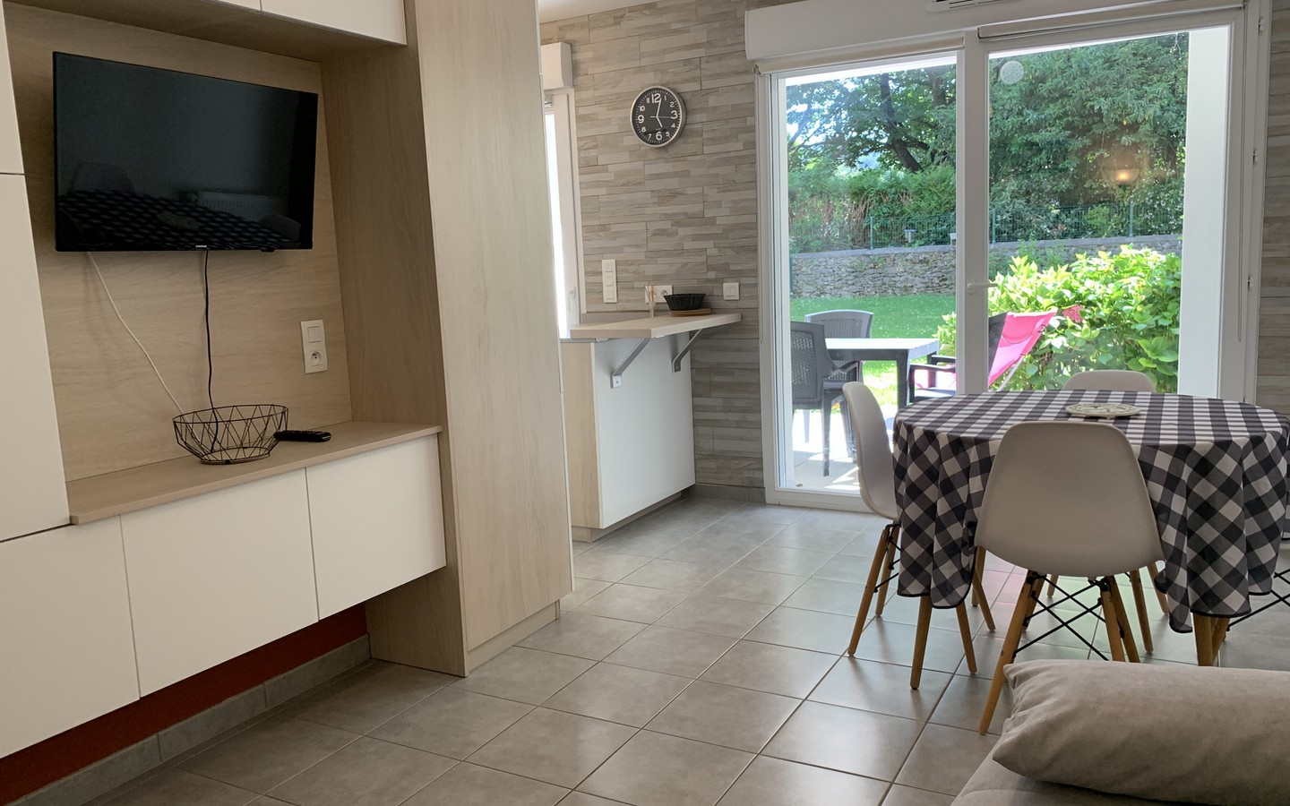 Grand appartement de 46 m² à la décoration moderne et situé à deux pas des commerces. La cuisine est équipée d'un four, lave-vaisselle, réfrigérateur et congélateur et est ouverte sur le séjour / salon doté d'un canapé, téléviseur écran plat. La chambre dispose d'un lit en 160. Salle d'eau avec douche. Les wc sont indépendants.