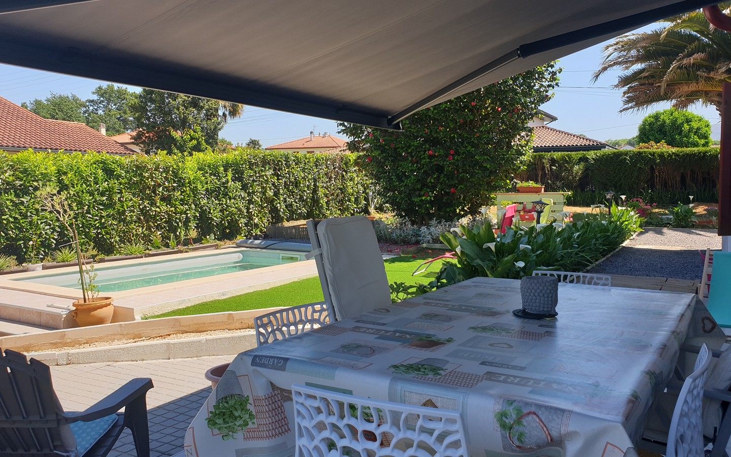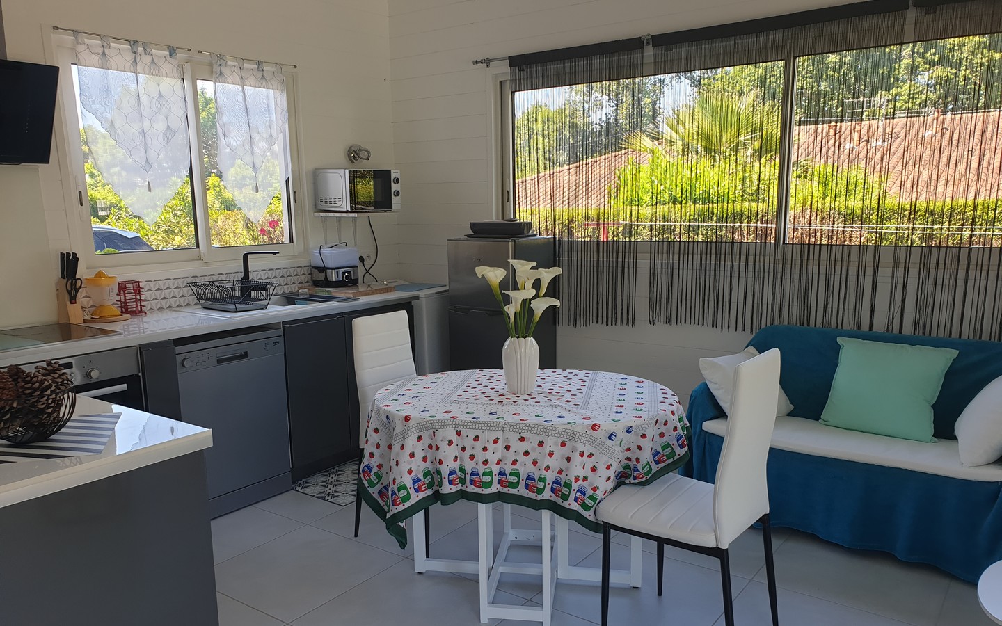 Appartement en rez-de-chaussée de la maison des propriétaires, situé dans un quartier résidentiel de Cambo-les-Bains. La cuisine équipée d'un four, micro-ondes, lave-vaisselle, lave-linge, et d'un réfrigérateur avec compartiment congélation est ouverte sur la partie salon avec banquette et téléviseur. La chambre est dotée d'un lit en 140. Les wc sont indépendants. En extérieur : parking, jardin, terrasse avec salon de jardin, barbecue, piscine privative, et spa privatif à la location.