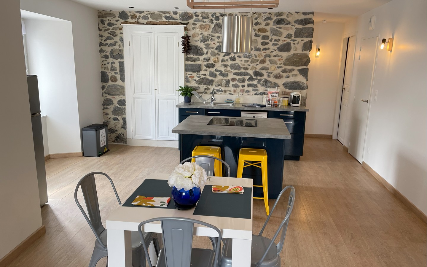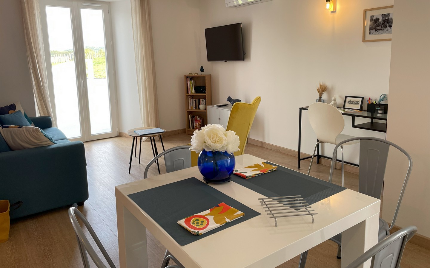 Appartement climatisé entièrement rénové comprenant un espace cuisine / séjour / salon. 1 chambre avec 1 lit en 160. Salle d'eau avec douche . Les WC sont indépendants. Wifi, Chauffage : climatisation réversible. Dans le hall d’entrée des deux appartements, nous proposons des jeux de société, des magazines, des livres sur la culture basque et du petit électro-ménager (appareil à raclette / crêpière…) en libre-service.