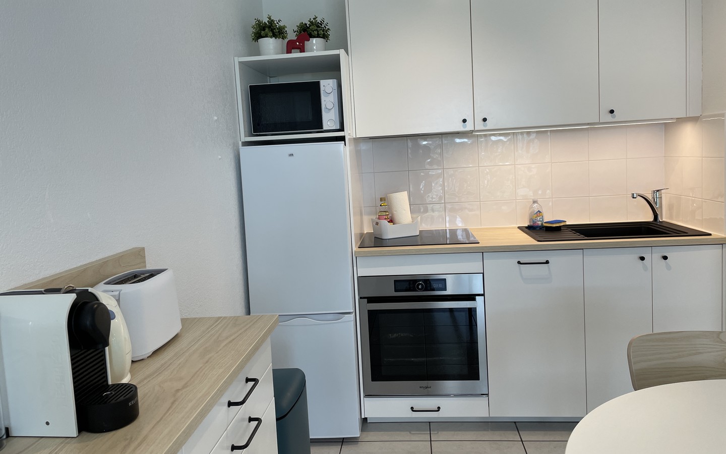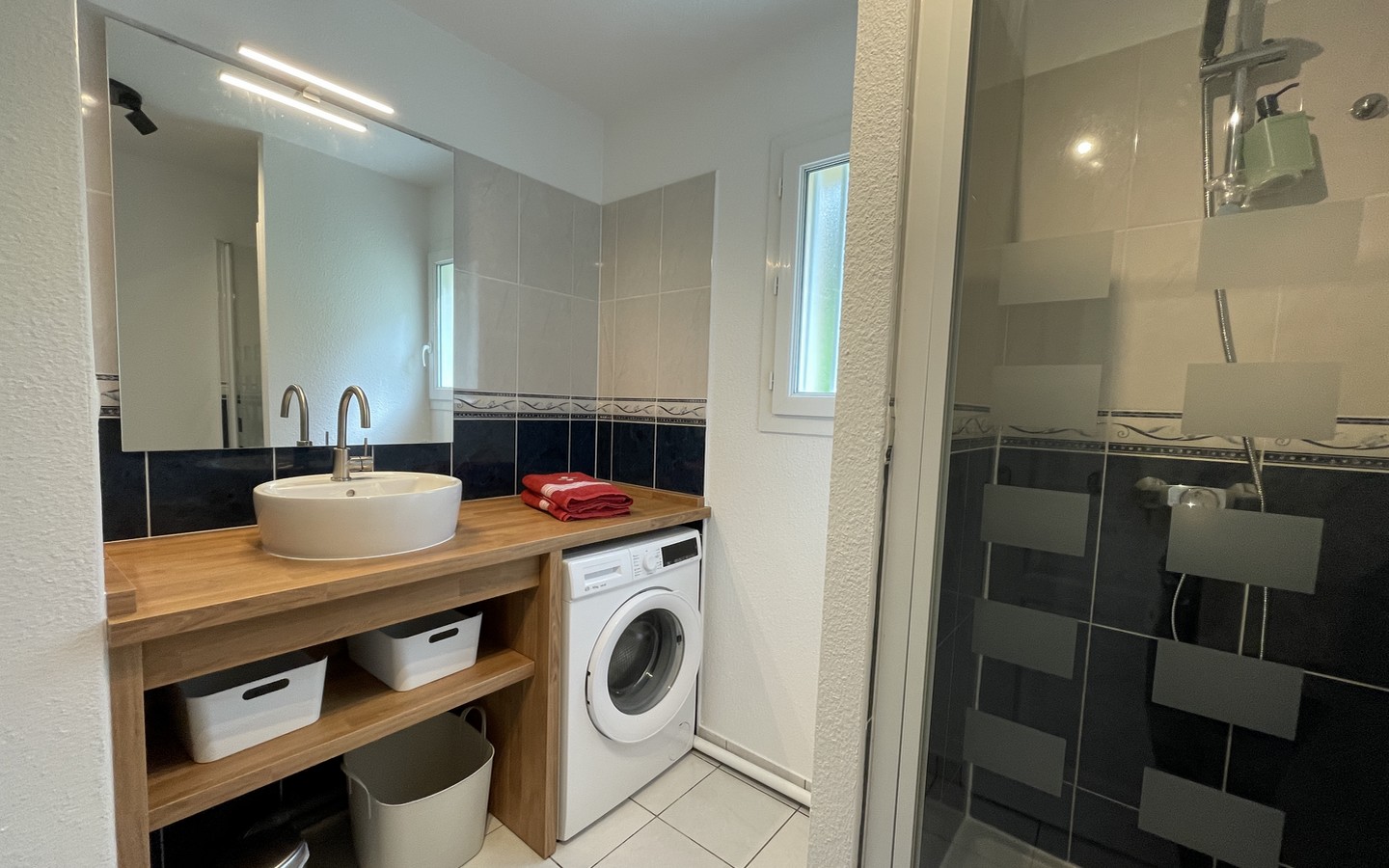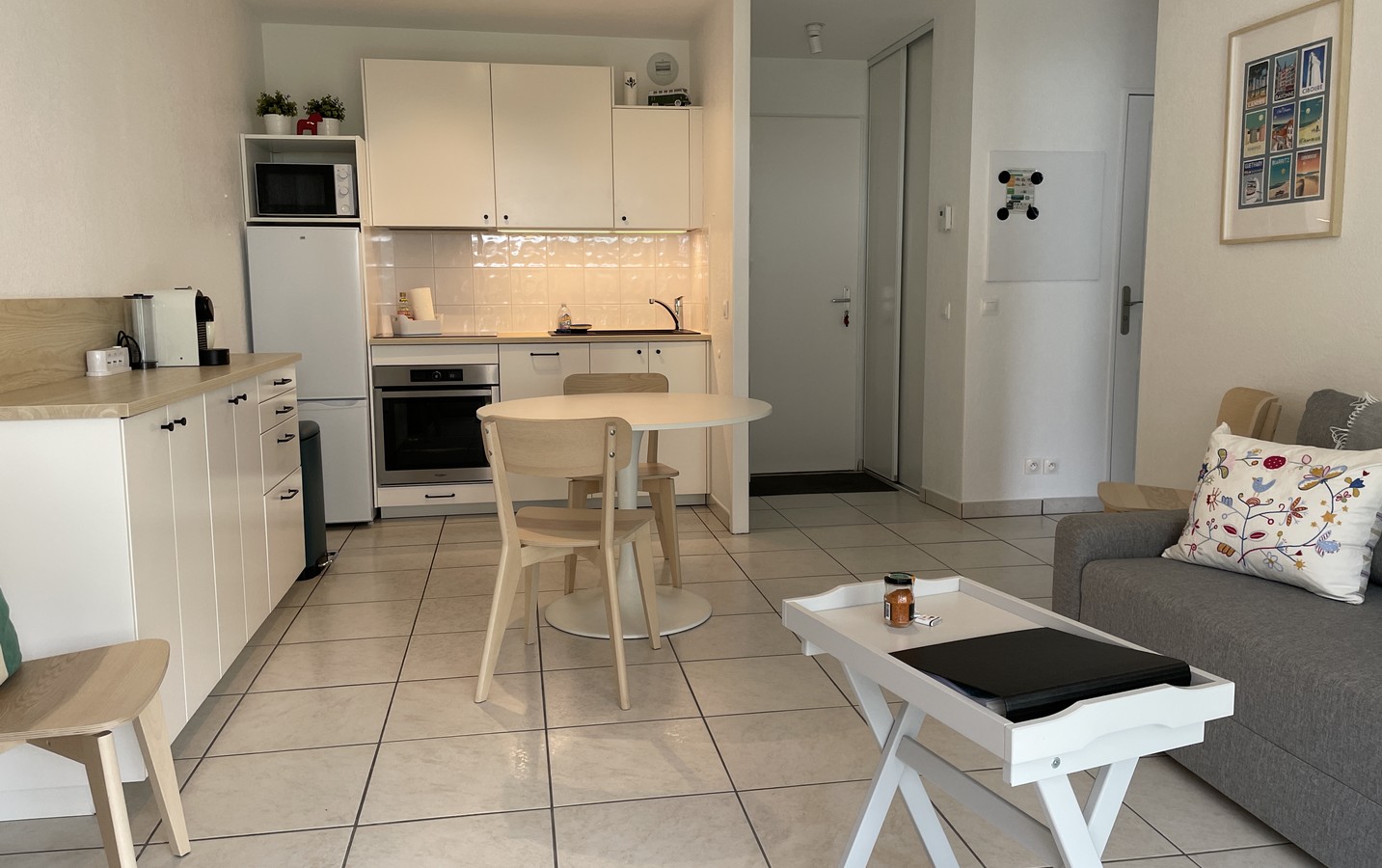 Appartement de 40 m² situé au 1er étage d'une résidence avec piscine commune et fronton. Le logement dispose d'un espace repas / cuisine et salon avec un canapé convertible, télévision, table et chaises. La cuisine est entièrement équipée. La chambre est dotée d'un lit en 140. Les WC sont indépendants de la salle d'eau avec douche et vasques.