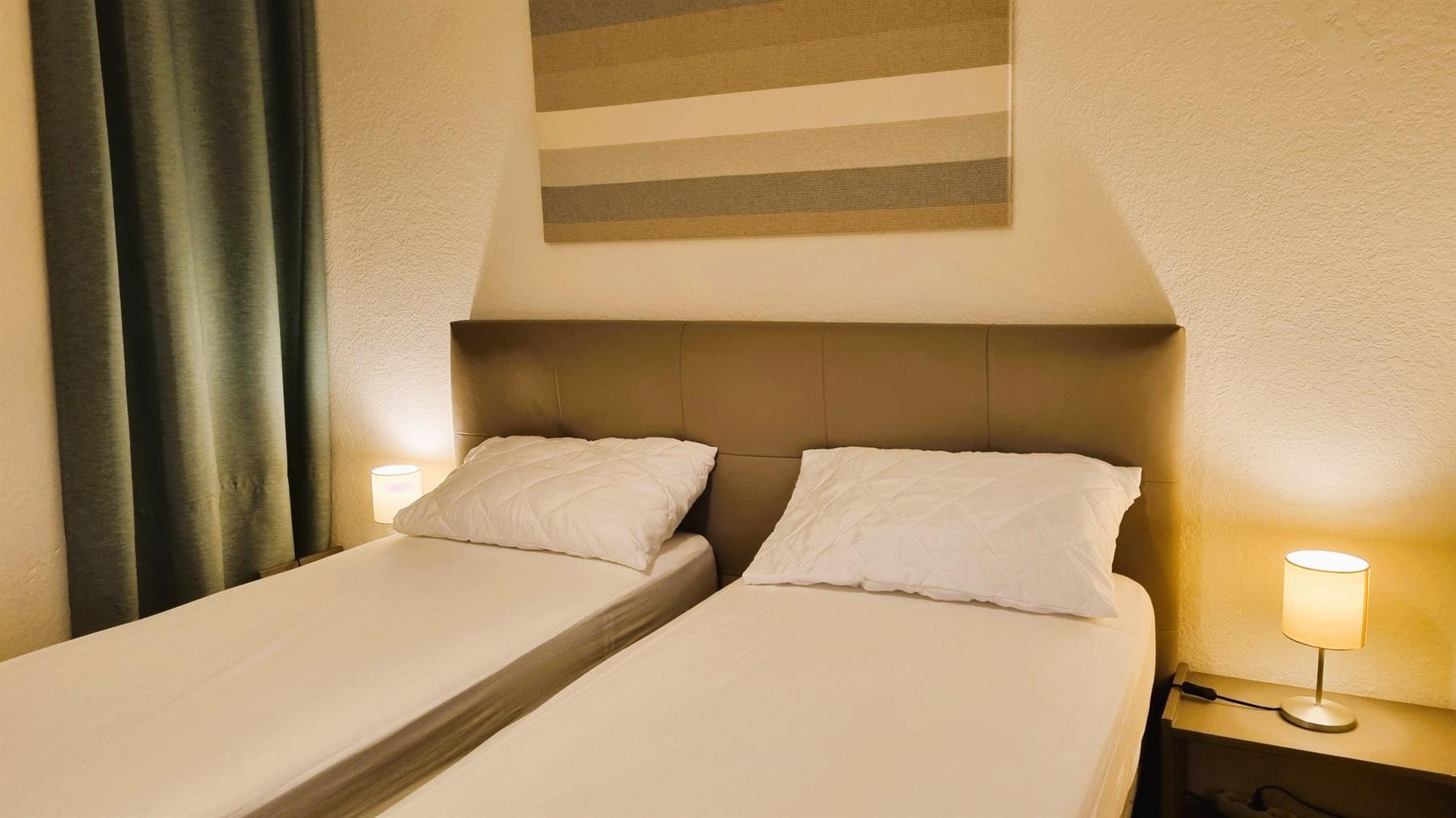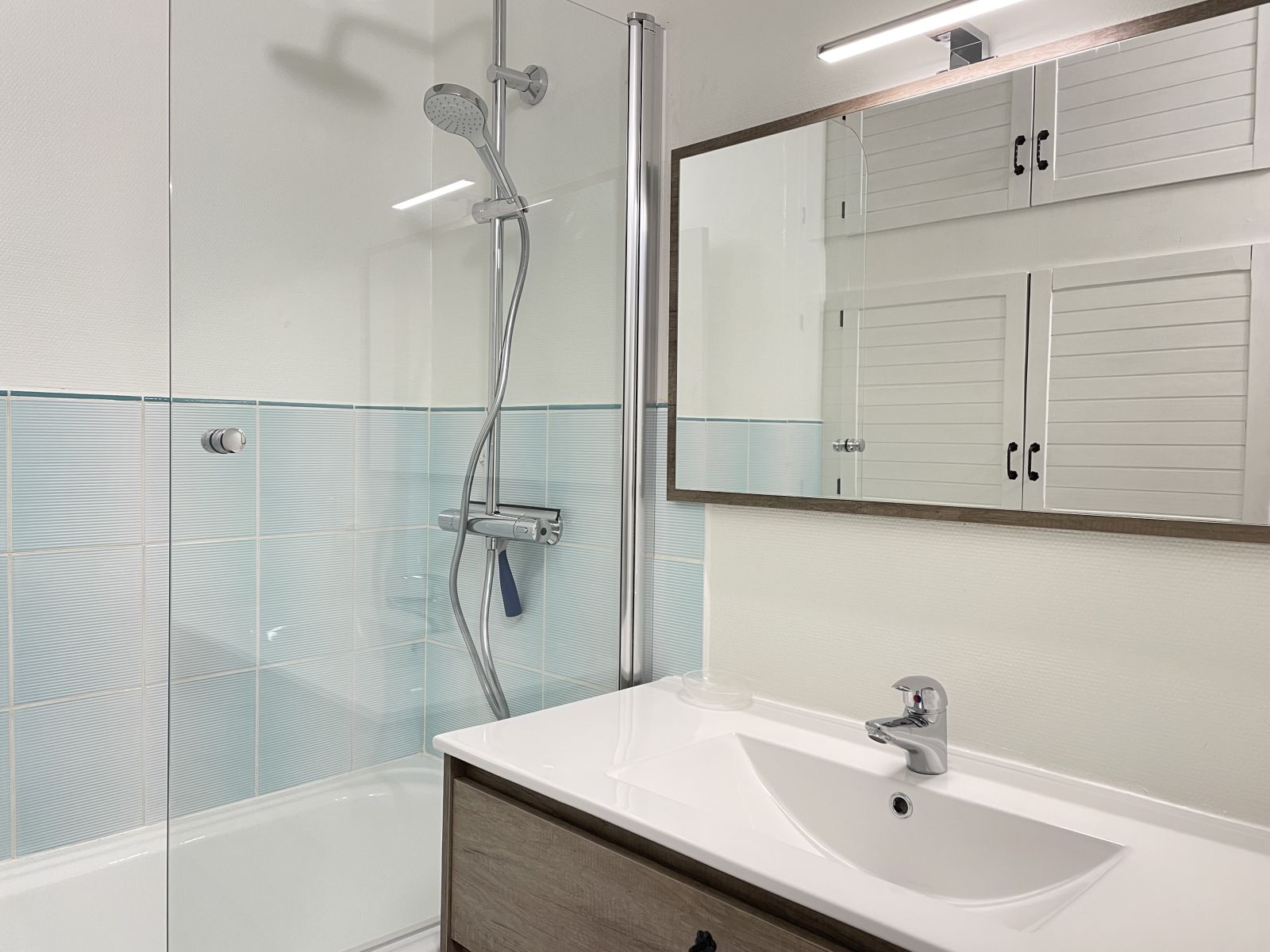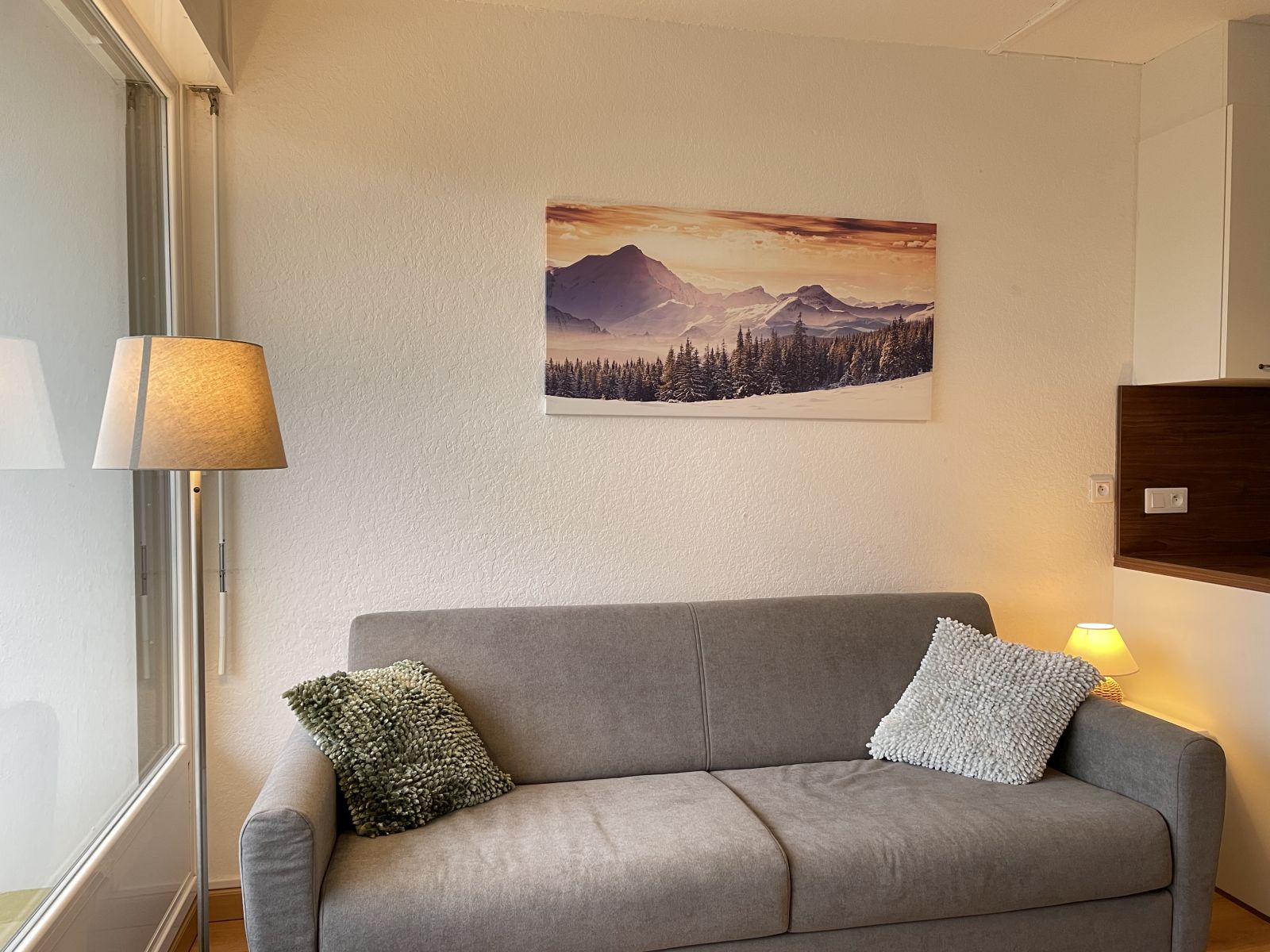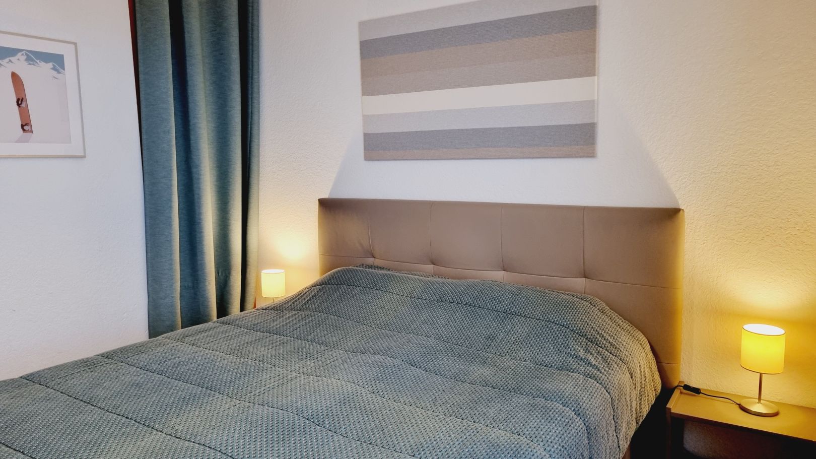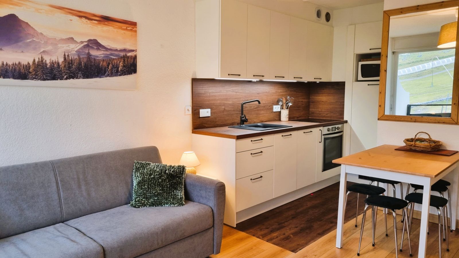 Il se compose d'une entrée avec un lit superposé (soit deux couchages en 90 cm), d'une salle de bains avec baignoire et d'un WC indépendant. La chambre, équipée d'un lit double en 160 cm (possibilité 2 lits séparés), offre une vue sur la vallée. Dans le séjour se trouve une banquette lit en 160 cm. La cuisine a été entièrement rénovée pour l'hiver 2024, ainsi que la salle de bains.