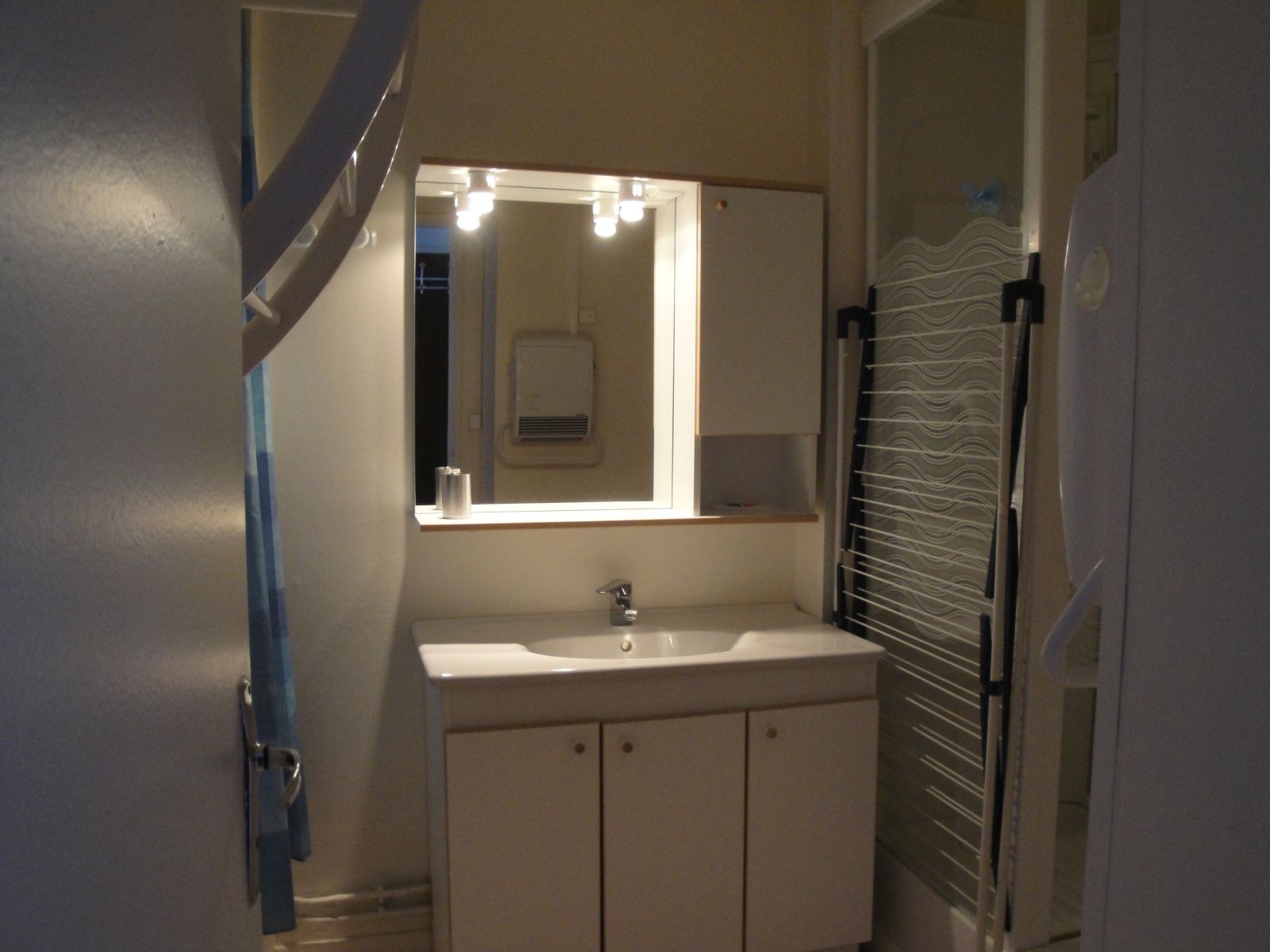 Dans le couloir, entre la chambre et le séjour se succèdent la salle d'eau avec lave-linge, les toilettes indépendantes et deux couchages superposés en 80 cm.