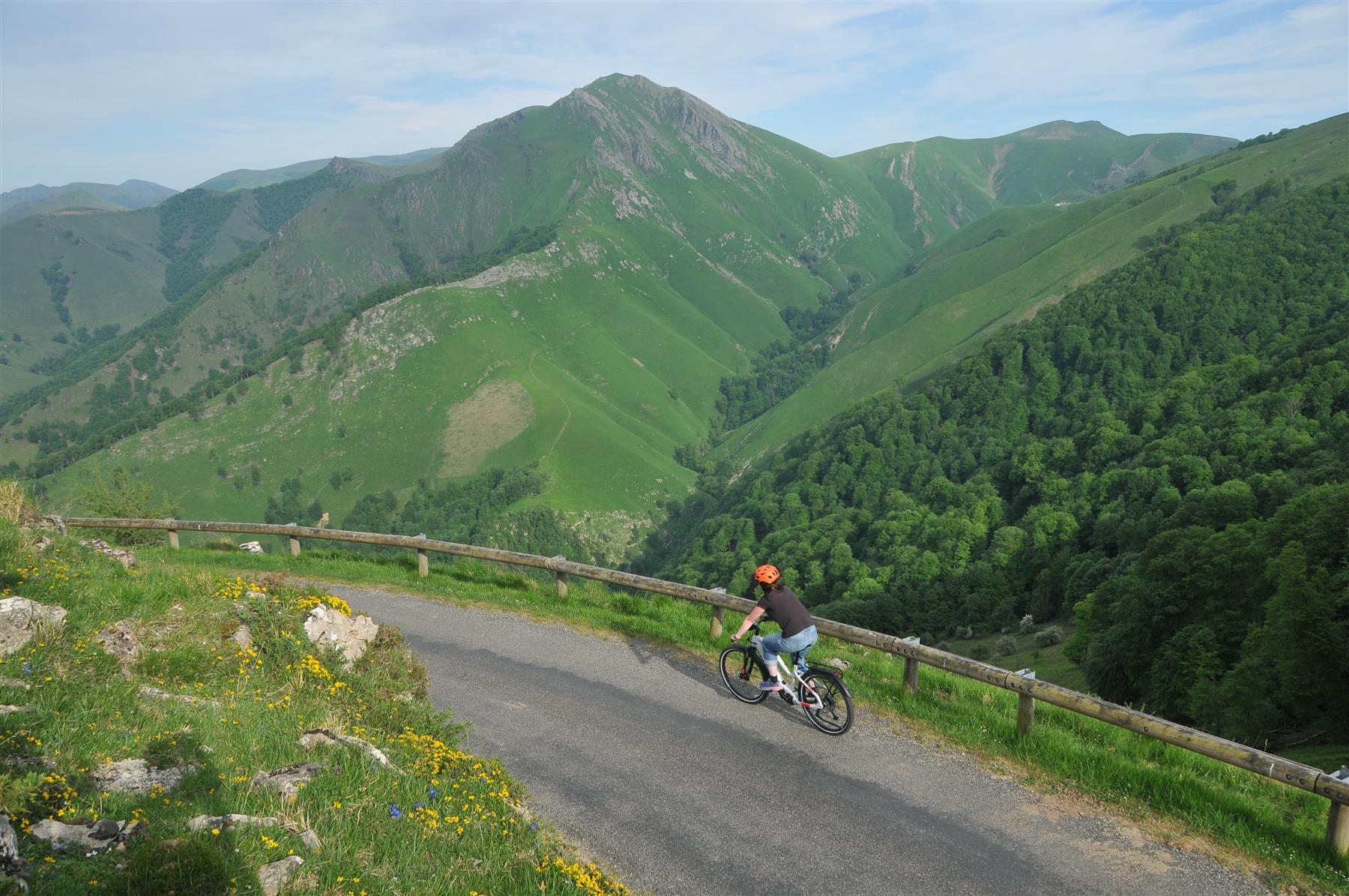 Etape 4 : Forêt d’Orion et berges de la Nive Au pied de la montagne d’Urkulu, le col frontalier d’Arnoztegi (29,2 km) n’est finalement pas franchi par la route ; elle se prolonge à gauche à flanc de versant, toujours très panoramique et assez plane. Un premier bois annonce le début d’une descente plus rapide et sinueuse dans les lapiaz (laissez sur la droite les accès aux cabanes pastorales). Une courte remontée en forêt oblige à jouer du dérailleur, puis la descente reprend en deux épingles. Au carrefour d’Iropile (35 km), continuer à gauche pour entrer bientôt dans la forêt d’Orion ; longue descente dans la hêtraie jusqu’au quartier de Béhérobie. En bas (42,5 km), emprunter le pont mitoyen de l’hôtel des Sources de la Nive (bar et abri vélos), et suivre la route à gauche, en fond de vallée. Laisser toujours les routes venant de la droite et rouler sur la rive droite de la Nive pour revenir à Estérençuby.