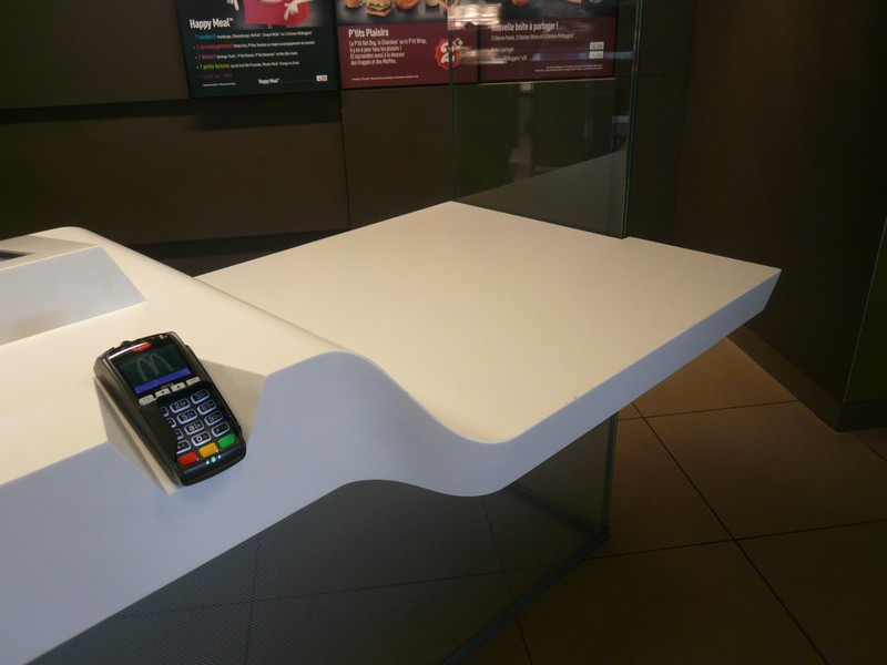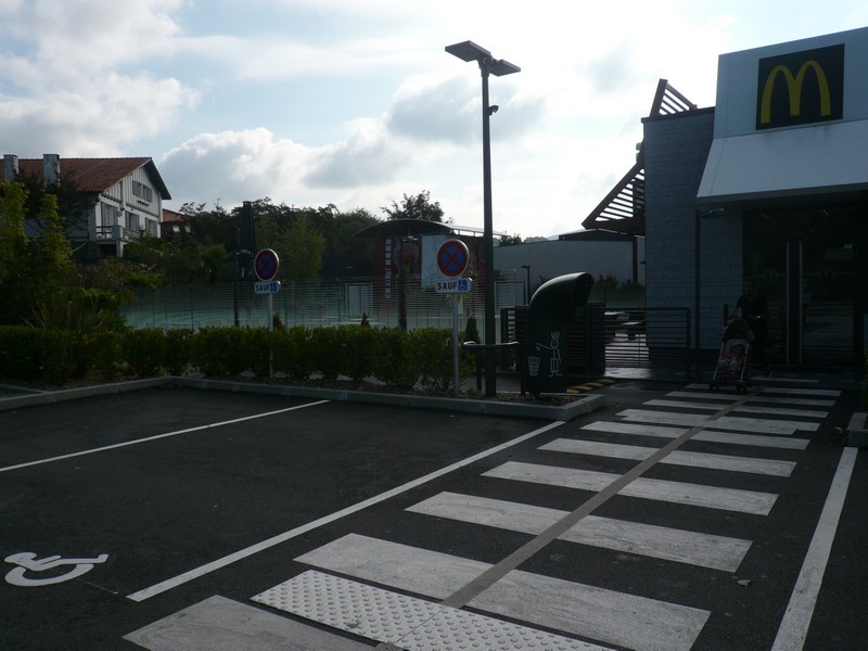 Il s’agit d’un établissement de restauration rapide neuf, de conception innovante avec une capacité de 140 couverts situé dans la station balnéaire d’Hendaye. La totalité de la chaîne de déplacement respecte le cahier des charges du label sur les quatre handicaps. Deux places de parking sont réservées et mises en connexion avec le restaurant par une coursive de 10 m de longueur en enrobé. Une aire de rotation est possible sur toute la chaîne de déplacement. Plusieurs bornes de sélection des menus sont adaptées en hauteur grâce à un onglet qui permet un affichage à la bonne hauteur. Un comptoir évidé à 70 cm permet l’accès aux fauteuils pour le règlement. Un bloc sanitaire neuf moderne homme et femme comprend des WC avec barre de transfert bien positionnée ainsi qu’un lavabo et matériels fixés à bonne hauteur. Le service peut être assuré à la table par le personnel. Le repas peut être pris en intérieur ou en terrasse extérieure. Présence de flashs d’alerte lumineux dans les toilettes ainsi que dans les secteurs lavabos. Plusieurs bornes pour les commandes présentent des menus imagés. Les prix et le choix des plats sont affichés, la signalétique est claire, connexion wifi gratuite. Il y a de bons contrastes de couleur sur toute la chaîne de déplacement. Un fil d’Ariane contrasté en relief et en couleur guide le client du parking jusqu’à la porte d’entrée. Présence de bandes d’alerte visuelles sur les portes vitrées. Aucune dangerosité à hauteur de visage, les menus sont affichés agrandis avec la photographie des plats. Aucune dangerosité sur la chaîne de déplacement, les plats sont proposés avec des descriptifs clairs et des photographies agrandies.
